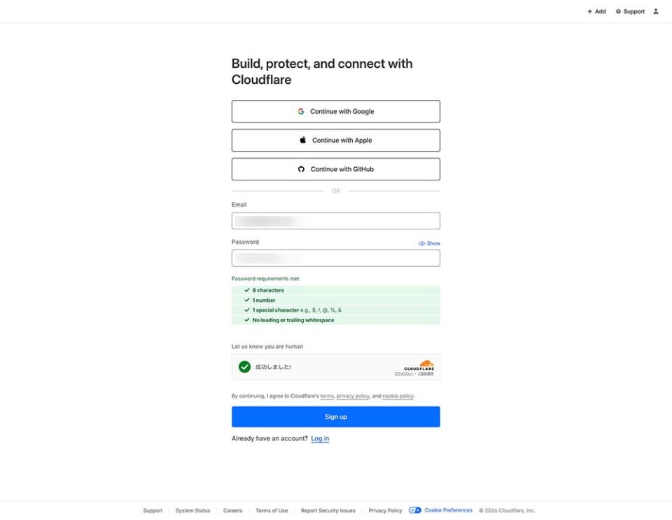 Cloudflareにログインします。アカウントを取得していない場合は、新たにアカウントを取得してください。