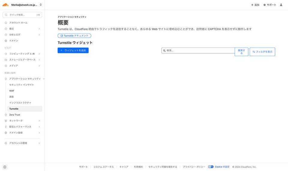ログイン後、左メニュー から「Turnstile」をクリックして、ウィジットを追加ボタンをクリックします。