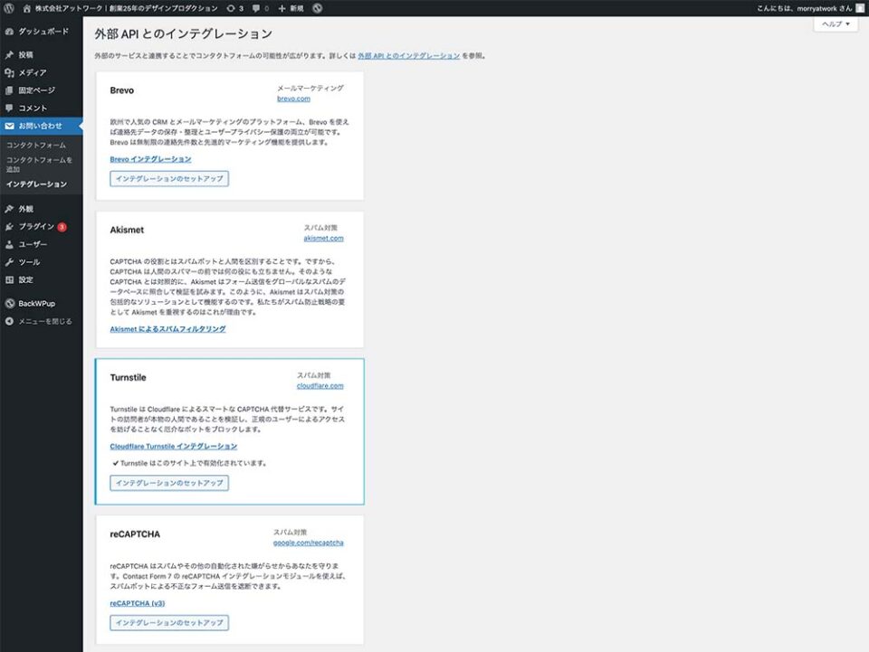 WordPressのダッシュボードからContactform7のタブをインテグレーションをクリックして、Turnstileのウインドウでインテグレーションのセットアップをクリックします。